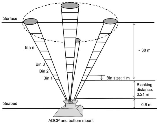 Schematic diagram of the setup of the upward-looking Teledyne RDI Workhorse Sentinel 300 kHz acoustic Doppler current profiler (ADCP) at the study site.