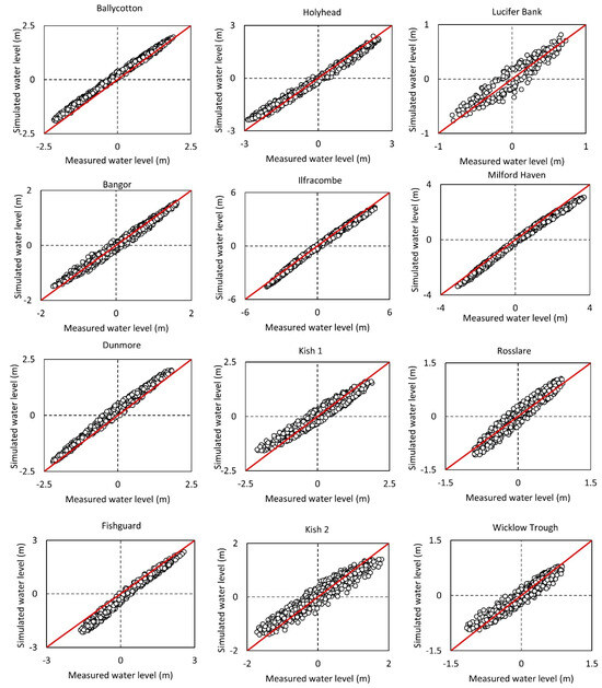 Water levels were re-assessed at eight tide gauges and four ADCPs along the Irish Sea coast and offshore of the south-east coast of Ireland, respectively, over the time periods outlined in Table 1. A strong positive relationship is evident between all measured and simulated water levels (Table 1) where the average correlation coefficient across all locations is 0.99.