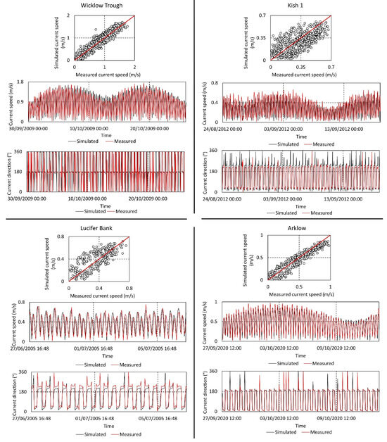 Similarly, simulated current speeds and directions were re-assessed against measured data at four locations, including the newly collected Arklow ADCP site. Generally, a strong positive correlation is evident, with the correlation coefficients ranging from 0.84 to 0.95 (Table 2). The notable 30° shift in the major axis of the tidal ellipse on Lucifer Bank shown Coughlan et al. [26] is still evident in this re-analysis. This may be due to the merging of at least two different bathymetry datasets in this location, none of which was captured at the time of the ADCP deployment. Changes in seabed morphology over time have the potential to subsequently alter local hydrodynamics.