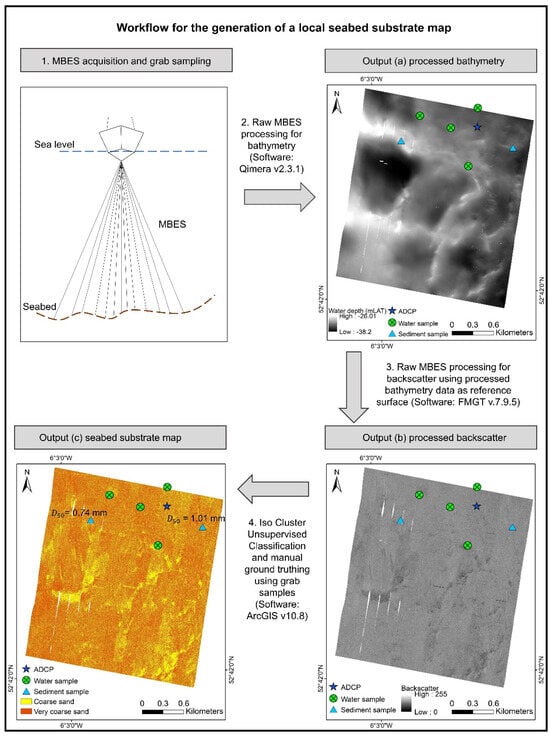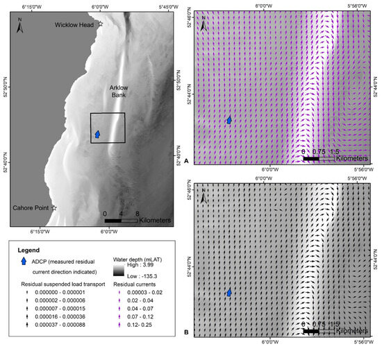 Reliable coastal and offshore sediment transport data is a requirement for many engineering and environmental projects, including port and harbour design [1], dredging and beach nourishment [2,3], sea shoreline protection [4], inland navigation [5], marine pollution monitoring [6], benthic habitat mapping [7], and offshore renewable energy (ORE) development projects including wave [8,9], tidal [10,11,12], and wind energy [13,14]. With the increased demand in marine resources for offshore renewable energy developments [15,16] a comprehensive understanding of sediment transport regimes on a local and regional scale in a coastal and offshore environment is imperative. The installation of infrastructure on the seabed, for example, wave and tidal energy converters and wind turbine foundations, alters wave propagation, flow patterns, and sediment circulation [12,17,18,19,20,21]. Specific oceanographic parameters effected may include turbulence, and mixing and vertical stratification, subsequently impacting sediment resuspension, sedimentation, temperature change, nutrient transport, and substrate availability [22,23]. In the far field, subsequent physical impacts to the marine environment could be detrimental, causing beach width reduction [24], or could be beneficial, aiding coastal protection [9,25]. The nature of this impact depends on the local oceanographic regime, the type and size of the ORE development, and lay-out configurations.