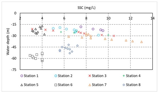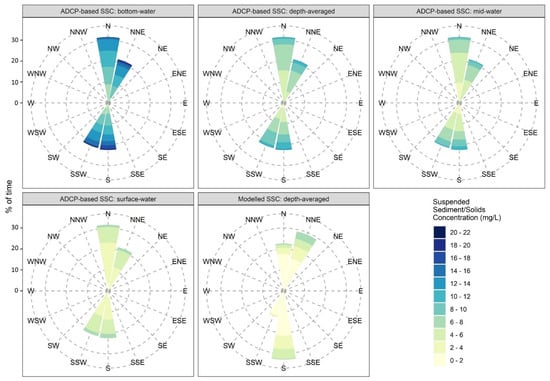 Therefore, in order to derive an estimated time series for throughout the water column at one location, the echo intensity () (counts) recorded along one beam (in this case, beam 4) of the deployed ADCP was processed and converted to relative backscatter () (decibels) through the following equation [54,67];