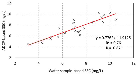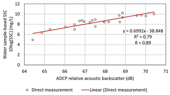 where and are the intercept and slope, respectively, determined by the regression of ADCP relative acoustic backscatter () with known measured on a semi-log plane in the form of [55,59,75], which is as follows: