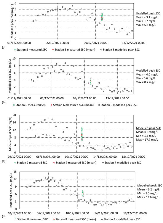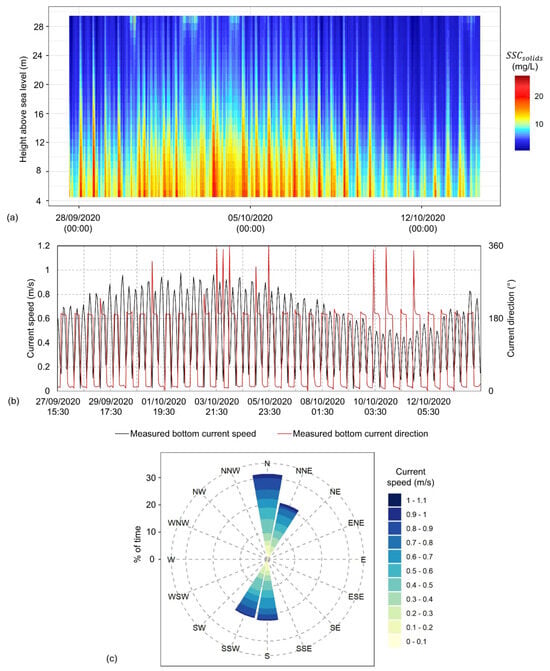 In many sediment transport studies only the underlying hydrodynamic and wave models are validated using in situ field data [8]. Where field sediment properties such as median grain size, sorting, grain density, etc., are available they act as inputs into these models, yet modelled sediment transport outputs are generally not validated. This may be due to limited data availability and associated high costs for data collection campaigns. Few studies have managed to quantify bed load transport through the use of bed level changes and sand wave migration characteristics derived from geophysical datasets [12,38,41]. Comparably, a limited number of studies have attempted to validate suspended sediment transport variables using optical backscatter sensors (OBSs) and transmissometers [11,42,43,44]. For example, a study off the coast of Anglesey, in the Irish Sea [11], validates a two-dimensional (2D) suspended sediment transport model using estimated suspended sediment concentration () from a Sequoia 100-X LISST (Laser In Situ Scattering and Transmissometry), calibrated via a number of water samples. This validation process was limited to one location, a 4-day observational dataset, and visual observation comparison techniques. From the published time series plot, modelled concentrations are clearly underestimated during peak spring flow. However, a spread is evident in the measured values as all depths are recorded and included in the validation process; this invokes an interpretation difficulty in the comparison against these measured values with the depth-averaged modelled values. Conclusively, there is clear paucity of investigation into the development of suspended sediment transport model validation techniques. Increased validation would ultimately improve the accuracy of numerical models, which is imperative for the acceleration of cost-effective engineering projects with a sustainable and environmental focussed ambition.