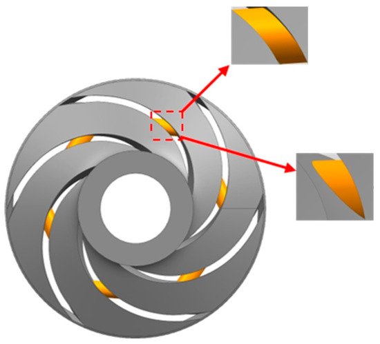 The study’s subject is a single-stage electric submersible pump, with a designed flow rate of Qdes = 140.00 m3/d, a single-stage head of Hdes = 5.79 m, a rated speed of n = 2917 r/min, and a specific speed of ns = 85.40. The calculation model consists of the inlet, impeller, diffuser, casing, and outlet. Table 1 shows the geometric parameters of the impeller and the diffuser. To enhance the fully-developed flow at the inlet and outlet, the lengths of the inlet and outlet sections of the electric submersible pump are extended to five and ten times the outer diameter of the impeller inlet, respectively, to prevent recirculation flow and reduce vortex losses. The entire computational domain is modeled using the three-dimensional modeling software UG-NX 12.0. For the blade-perforated electric submersible pump selected in the paper, the distance from the hole center to the blade center was 27.5 mm, the hole diameter was 5 mm, and the hole cross-sectional area was 19.63 mm2. The impeller with a blade perforation and the corresponding perforation parameters are shown in Figure 1 and Figure 2.