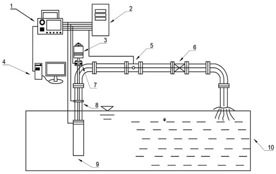 Schematic of the external characteristics test rig. 1. Data logger. 2. Power distribution cabinet. 3. Electric motor. 4. Computer. 5. Flowmeter. 6. Discharge pipeline valve. 7. Torque meter. 8. Discharge pipeline. 9. Electric submersible pump. 10. Open sump.