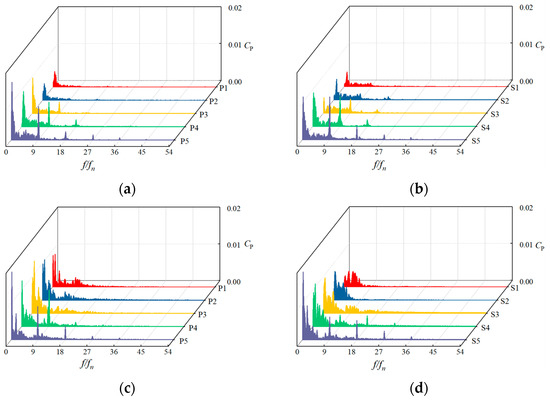 Frequency domain analysis of impeller suction surface and pressure surface pressure pulsation at 1.0 Qdes. (a) Pressure side, without blade perforation; (b) suction side, without blade perforation; (c) pressure side, with blade perforation; (d) suction side, with blade perforation.