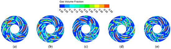 ESP Gas phase transient distribution in ESP with blade perforation under 0.6 Qdes. (a) T0; (b) T0 + 0.2T; (c) T0 + 0.4T; (d) T0 + 0.8T; (e) T0 + 1.0T.