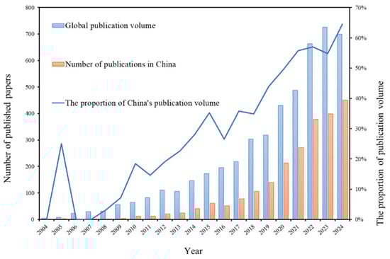 The trend in the number of publications in the SAs treatment research area in WoS over the years is shown in Figure 1. The research on SAs has been increasing in popularity over the last 20 years, with an overall upward trend in the number of articles published globally. The overall research is divided into three phases: (I) 2004–2008 was the initial research exploration phase; the SAs treatment field received little attention, and the annual number of publications was less than 50. (II) 2009–2016 was the slow development phase; the annual number of publications showed a rapid growth trend, but the annual number of publications was still less than 200. (III) 2017–2024 was the in-depth research phase; the number of publications showed a rapid growth trend, and the number of publications in eight years accounted for 79% of the total number of publications, which indicates that the environmental problems caused by SAs are of wide concern. From 2004 to 2016, the total number of articles published by domestic scholars was less than 300. However, with the release of the “Water Ten Plan” in 2015 [12] and the “New Pollutant Management Action Programme” issued by the General Office of the State Council in 2024, and the gradual exposure of water pollution caused by SAs in the process of urban development, research in this field has increased and the number of publications has been on a rapid increase. In 2024, the annual number of publications in China has reached 451, accounting for 65% of the total number of publications worldwide in that year, indicating that both the importance and the number of results of SAs treatment research by domestic scholars are increasing.