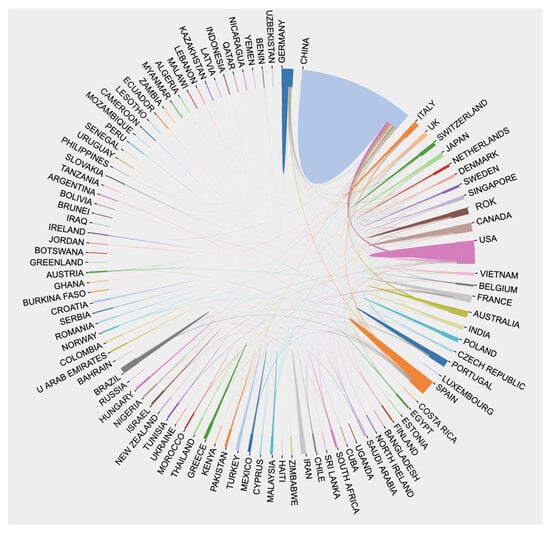 Cooperation and exchange between countries is important for the dissemination of knowledge. The bibliometric online analysis platform software was used to analyze inter-country cooperation between the main publishers to capture the cooperation between different countries in the field of SAs research. The network of academic collaborative relationships between the 100 issuing countries from 2004 to 2024 is shown in Figure 2. The connected lines indicate that countries have collaborative relationships with each other, and the size of the shaded area indicates how many articles are issued by that country. As can be seen, the largest number of publications and the most extensive collaborative relationships are with China, which has collaborative relationships with dozens of countries, including the USA, Spain, Germany, Portugal and Canada, and has the closest collaborative relationship with the USA. The close cross-section of cooperation between countries indicates that the environmental problems caused by SAs are of common concern on a global scale.