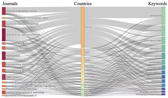When exploring hotspots on research topics, keywords in the literature need to be analyzed. After processing by the Biblioshiny program, the Sankey diagram between the top 15 hot source journals (left), countries of publication (center) and high-frequency keywords (right) in the SAs processing research area is shown in Figure 3. As can be seen, the hot journals are concentrated in Science of the Total Environment, Chemosphere and Chemical Engineering Journal. As the country with the highest number of publications, our papers were concentrated in the journals Science of the Total Environment and Chemical Engineering Journal, with high-frequency keywords, such as antibiotics, SMX, adsorption and antibiotic resistance genes. This indicates that SAs are frequently detected in wastewater and that the attention of Chinese scholars on SAs is mainly focused on drugs, such as SMX. Among the environmental problems caused by different types of SAs, the contamination of antibiotic resistance genes has received the most attention. At the same time, among the treatment methods based on SAs, adsorption has been chosen for the removal of SAs, but there are some new techniques applied for the removal of SAs.