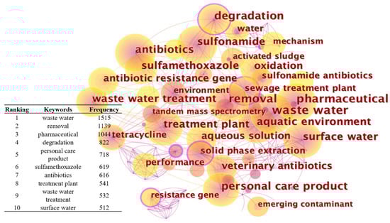 In CiteSpace, we conducted the analysis using 2-year time slices spanning from 2000 to 2024. The parameters were configured with thresholds set at the top N = 20 items per slice, a minimum co-occurrence frequency of 5, and a betweenness centrality ≥0.1 to identify key nodes. A visual analysis of the co-occurrence of keywords appearing in the 4878 articles retrieved showed that 22 keywords were appearing more than 300 times. Figure 4 shows the co-occurrence network diagram for the keywords, where the size of the circles in the diagram reflects the frequency of the keywords, the higher the frequency, the larger the circles [14]. The size of the keyword node label represents the mediated centrality of the keyword, and in CiteSpace, nodes with a mediated centrality of more than 0.1 are considered critical nodes. The line between the nodes represents the co-occurrence of keywords; the thicker the line, the greater the frequency of co-occurrence. As can be seen in the graph, the keywords that appear more than 1000 times are “wastewater”, “removal” and “pharmaceutical”, indicating that SAs are an important class of antibiotics that enter the environment mainly through wastewater discharge. The keywords that appeared more than 500 times were “degradation”, “personal care products”, “sulfamethoxazole”, “antibiotics”, “treatment plant”, “wastewater treatment” and “surface water”. This indicates that SMX in SAs is a key pharmaceutical of concern; residual antibiotics and personal care products in wastewater treatment plants are a major source of SAs in the aqueous environment and have received increasing attention, while in recent years the research focus has gradually shifted to the search for efficient methods to remove SAs. The analysis of the keywords will help to gain an in-depth understanding of the transport and transformation behavior of SAs in the environment and their potential impact on the water environment, providing a valuable reference for the development of effective control and management strategies.