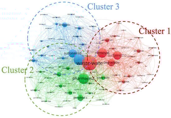 To further explore the research hotspots of SAs, VOSviewer 1.6.20 software was used to cluster the main keywords, and keywords with similar research topics were clustered and represented by the same color. The results are shown in Figure 5. The default LLR (Log-Likelihood Ratio) algorithm was employed to automatically generate cluster labels based on the keyword co-occurrence network. The keywords for SAs were divided into three main categories through cluster analysis. Cluster 1 focuses on the treatment methods for SAs, including advanced oxidation, adsorption, ozone oxidation, biodegradation and photocatalysis, etc. The keywords for Cluster 2 are mainly Sulfonamides resistance genes, and SAs entering environmental water bodies will induce resistant microorganisms and ARGs in the environment, accelerating the migration transformation, and posing a threat to the water environment and human health. The keywords in Cluster 3 focus on sources of contamination in water and testing techniques. As can be seen from this category, studies on contaminants in water mainly include pharmaceuticals, personal care products, methamphetamine pyrimethamine and lidocaine, which are often detected in sewage treatment plants, aquatic environments, surface water and groundwater. Water sampling techniques mainly include solid phase extraction and mass spectrometry. In addition, risk assessment of SAs has been a topical issue in the field of water environmental protection in recent years. Of these three categories, SAs treatment methods have received the most attention, indicating that scholars from various countries have conducted research and achieved important results on the residues of SAs, their toxicity in the environment and their biodegradation in different treatment processes and environments.