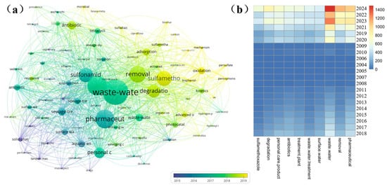Keyword hotspot maps provide a visual representation of the evolution of research hotspots over time. The analysis of the occurrence time of the co-occurring keywords in Figure 6a revealed that mass spectrometry, tandem mass spectrometry and solid phase extraction were the hot spots of research before 2015, during which the pre-treatment method of samples mostly used solid phase extraction, and for the analysis of SAs, mass spectrometry and tandem mass spectrometry were mainly used. However, over time, the new keywords, such as aquatic environment, personal care products, sulfanilamide, biodegradation and wastewater treatment, started to emerge in 2016–2018, and it can be seen that biodegradation became the main treatment method in this period and that the problems caused by SAs and personal care products are gaining more attention from researchers due to their increasingly prominent impact in the aquatic environment. Until 2018, the terms sulfamethoxazole, degradation, adsorption, sulfamethoxazole, oxidation, photocatalytic oxidation and resistance genes appeared more and more frequently. This indicates that researchers are beginning to turn to research on the application of treatment technologies for SAs in the aqueous environment, with adsorption and advanced oxidation techniques, such as ozone catalysis, and photocatalysis gradually becoming hot technologies for the treatment of SAs. Among these, SMX and sulfamerazine (SMR) in SAs have become important pollutants of interest for research. As the research hotspots on SAs change, subsequent efforts should focus on developing more efficient treatment technologies for SAs.