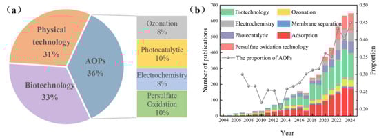 In recent years, for SAs, water treatment technology is mainly divided into biological treatment technology, physical separation technology and advanced oxidation processes [30,31,32]. Comparing the application of commonly used technologies, it was found that advanced oxidation technologies accounted for the highest number of publications at 36%, followed by biological treatment technologies and physical separation technologies at 33% and 31%, respectively (Figure 7a). The advanced oxidation processes (AOPs) can also be divided into ozone oxidation, electrochemical technology, photocatalytic oxidation and persulfate oxidation [33,34,35]. Also, in Figure 7b, a trend of increasing numbers of publications on SAs water treatment technologies was found year-on-year between 2004 and 2024. It is worth noting that although AOPs started later, their publication volume has increased sharply since 2018 and continues to rise, accounting for a higher percentage each year. Among them, research on persulfate oxidation technology has also started to gradually increase, and in the past two years, the number of publications has even surpassed that of ozone oxidation technology and photocatalytic oxidation technology, occupying the main position. This phenomenon is probably due to the significant advantages of persulfate oxidation technology in the treatment of SAs.