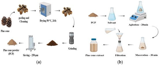 Pine cones were sourced from fields in Mila, Algeria. The preparation process for Pine cone powder (PCP) is outlined in Figure 1a. Initially, the cones were manually selected and peeled to remove unwanted materials. They were then dried in an oven at 50 °C ± 1 °C for 24 h to reduce moisture content. Once dried, the cones were finely ground using a domestic grinder and subsequently sieved through a 250 μm laboratory sieve to obtain a uniform powder.
