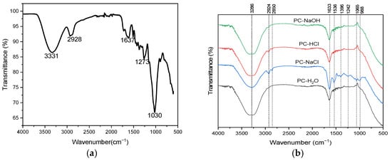 FTIR spectra of (a) Pine cone powder and (b) Pine cone extracts: PC-H2O, PC-NaCl, PC-NaOH, and PC-HCl.