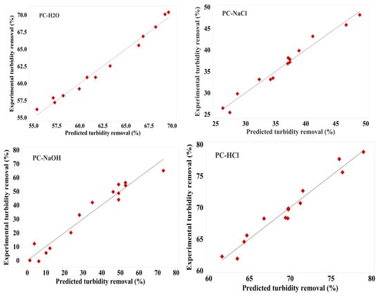 The models’ robustness further validates their predictive capability, as shown by the close clustering of points along the diagonal line, indicating a strong correlation between observed and predicted values [51,52,53]. This correlation is demonstrated in Figure 3. These figures illustrate the relationship between the actual and predicted values of turbidity removal from simulated drinking water using the four Pine cone extracts: PC-H2O, PC-NaCl, PC-NaOH, and PC-HCl. The observed values represent the original turbidity removal measurement in solution, obtained experimentally, while the predicted values were generated using Equations (3)–(6).