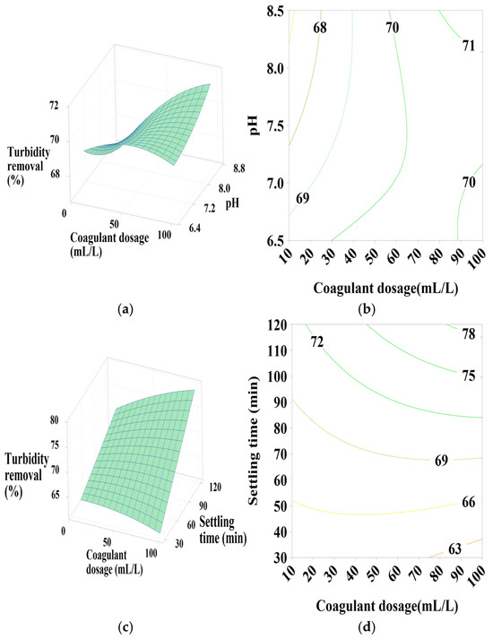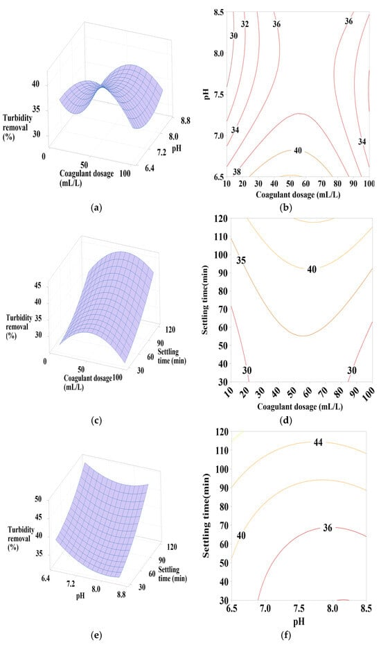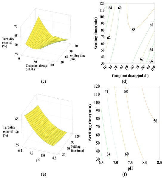 The increase in settling time also leads to an increase in turbidity reduction efficiency, as shown in Figure 6c,d. With a coagulant dosage of 50 mL/L, the positive quadratic effect of coagulant dosage is observed. Similarly, Figure 6e,f shows that maximum turbidity removal is achieved with maximum settling time and minimum pH values, indicating a positive linear and quadratic effect of pH.