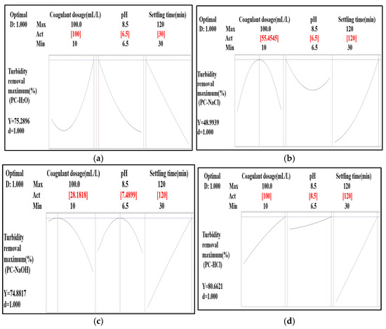 Effects of factors on turbidity reduction for the four Pine cone extracts: (a) PC-H2O, (b) PC-NaCl, (c) PC-NaOH, and (d) PC-HCl.