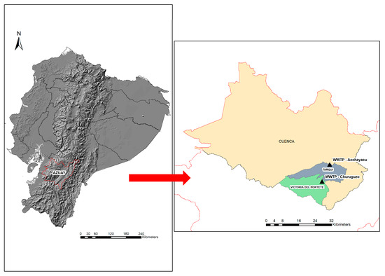 This study was conducted at two decentralized wastewater treatment plants (WWTPs), Acchayacu and Churuguzo, which are located in the parishes of Tarqui and Victoria of Portete, respectively, in the Azuay province of the southern Ecuadorian Andes (Figure 1). These WWTPs are approximately 14 km apart. Acchayacu is located at 2689 m above sea level (m.a.s.l.), and Churuguzo is at 2628 m.a.s.l.; they experience similar climatic conditions. The effluents from both systems discharge into brooks that flow into the Irquis river, a tributary of the Tarqui river. This water body plays a crucial role in supporting the agricultural and livestock activities of the surrounding communities.