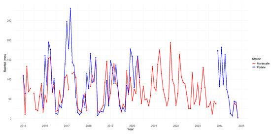 The average precipitation recorded at the Morascalle (737.98 mm/year) and Portete (532.18 mm/year) stations does not show a statistically significant difference, according to the results of the t-test (p = 0.085) and the non-parametric Mann–Whitney test (p = 0.296). Although the mean precipitation at Portete is higher, the confidence intervals for the difference in means include zero values, indicating that the null hypothesis of equality between the stations cannot be rejected. Furthermore, the data distributions of the stations are similar (Figure 2 and Figure 3), suggesting that the observed variations could occur by chance. However, it is important to note that the presence of missing data (10 from Morascalle and 50 from Portete) may have influenced the results.