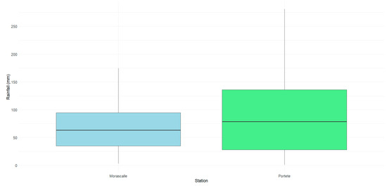 To compare the precipitation data from the Morascalle and Portete stations, a statistical analysis based on hypothesis tests was conducted. At first, descriptive and graphical explorations were performed using box diagrams and a precipitation value graph for each station to assess the differences between the two locations.