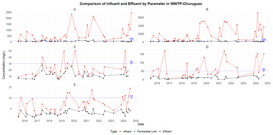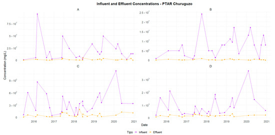 Churuguzo—Comparison of influent and effluent concentrations (2015–2020): (A) TC, (B) TTC, (C) BOD5, and (D) COD.