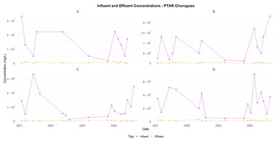 Churuguzo—Comparison of influent and effluent concentrations (2021–2024): (A) TC, (B) TTC, (C) BOD5, and (D) COD.