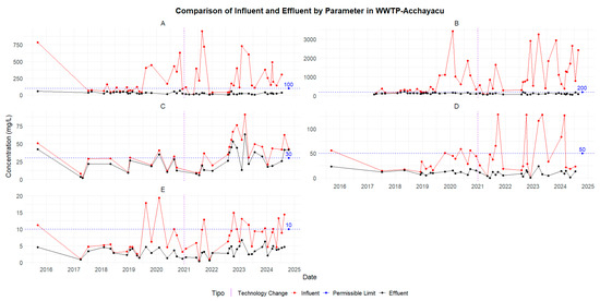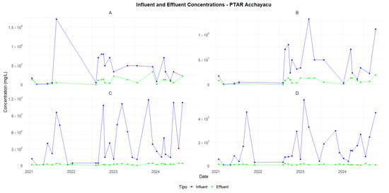 Acchayacu—Comparison of influent and effluent concentrations (2021–2024): (A) TC, (B) TTC, (C) BOD5, and (D) COD.