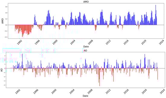 Climate represents the average atmospheric conditions that influence global weather phenomena over long periods, whereas weather refers to a short-term atmospheric state that changes frequently. Long-term climate change-driven changes have various impacts worldwide, including natural disasters, ecological changes, and social and economic losses. To analyze these climate changes, 15 climate indices were provided by the National Oceanic and Atmospheric Administration (NOAA): https://www.ncei.noaa.gov (accessed on 23 January 2024) [26]: AMO [27], AO [28], Heat Content [29], MEI [30], NAO [31], NINO3.4, NINO3, NINO4 [32], NP [33], OLR, ONI [34], PDO, PNA [35], SOI [36], and TNI [37], as shown in Figure 2.