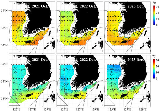 Stable S. japonicus samples were obtained from the Jeju region from August to December, but the S. japonicus collected from the Yellow Sea in December were limited to 2021. To investigate the temporal variability in samples collected from the Yellow Sea, the regional sea surface temperature (SST) fluctuations during August–December 2021–2023 were examined. Temperature data from each subarea were compared using in situ SST observations from the National Fisheries Research and Development Institute (NFRDI) marine surveys, as provided by the Korea Ocean Data Center (KODC). The relatively higher SSTs observed in the Yellow Sea until December 2021 likely facilitated the collection of S. japonicus samples in that year (Figure 2).