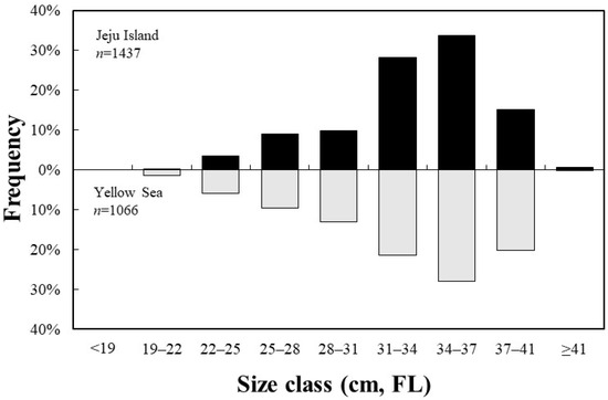 A total of 1437 S. japonicus specimens were collected from the Jeju region, with an average fork length of 33.2 cm, ranging from 21.0 to 43.6 cm. A total of 1066 specimens were collected from the Yellow Sea, with an average fork length of 32.8 cm, ranging from 19.6 to 41.5 cm (Figure 3).