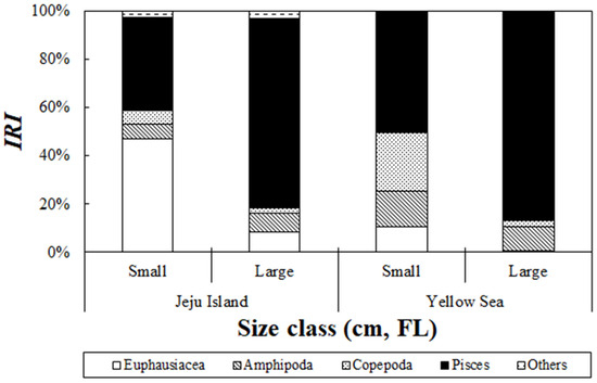 Ontogenetic changes in the composition of chub mackerel, Scomber japonicus, from the waters around Jeju Island and the Yellow Sea based on the index of relative importance (%IRI) across size classes (small: 34.0 cm; large: ≥34.0 cm). In Jeju waters, small individuals primarily consumed euphausiids, whereas large individuals consumed a higher proportion of fish. In the Yellow Sea, fish were dominant in both size classes, with small individuals consuming more copepods and amphipods compared to large individuals.