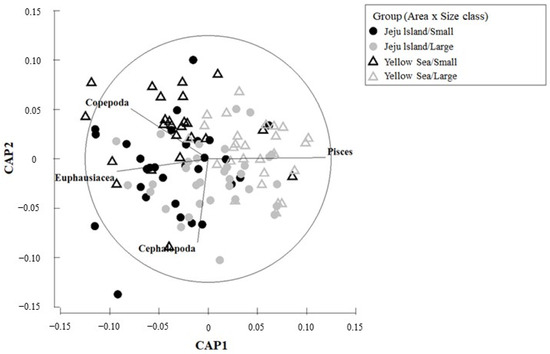 In the CAP analysis for habitats and size groups (Figure 5), copepods, euphausiids, and cephalopods were the primary contributing factors in the Jeju small-size group, whereas copepods and euphausiids were the main contributing factors in the Yellow Sea small-size group. In both Jeju and Yellow Sea large-size groups, fish were the major contributing factor, indicating that similar prey resources were formed in both habitats.