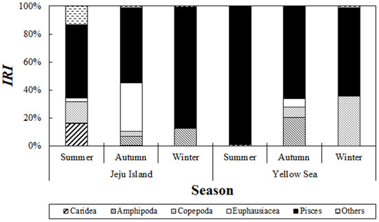 Seasonal changes in the composition of chub mackerel, Scomber japonicus, from the waters around Jeju Island and the Yellow Sea based on the index of relative importance (%IRI) across seasons: Summer: August; Autumn: September to November; Winter: December. Fish were the dominant prey item in the diet across all seasons.