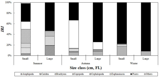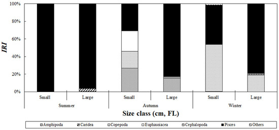 Analysis of the seasonal variation in the composition of stomach contents based on the size class of S. japonicus collected from the Jeju Sea revealed differences in prey composition based on season and size class (Figure 7). In the summer, fish accounted for 34.0% of the relative importance index in the small-size class, making it the most dominant prey item, and then followed by cephalopods and euphausiids, which contributed 26.5% and 14.7%, respectively. In the large-size class, fish also dominated and accounted for 53.5%, followed by caridean shrimp and copepods at 18.8% and 16.9%, respectively. In autumn, euphausiids dominated the small-size class with 52.7% of the relative importance index, whereas fish remained the primary prey in the large-size class, accounting for 74.5%. In winter, fish were the dominant prey item in all size classes, contributing 78.0% and 91.3% in the small- and large-size classes, respectively.