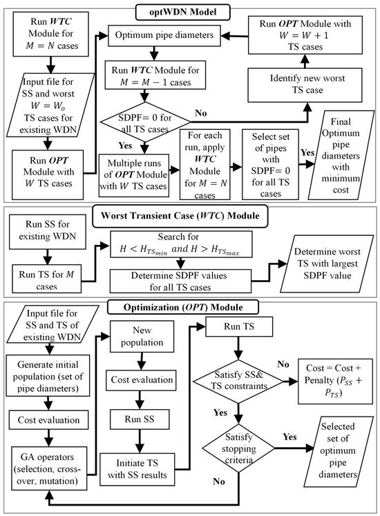 The optWDN model applies a genetic algorithm (GA) to determine the optimum diameters for pipes to be added in parallel to existing WDN pipes. The objective is to identify the pipe diameters that provide surge protection for the WDN and give the least cost. The optWDN model was coded in MATLAB version 2018a and consists of two hydraulic simulators and two modules (Figure 1). The hydraulic simulators are the steady-state simulator (SS) and the transient simulator (TS). The modules are the Optimization (OPT) module and the Worst Transient Case (WTC) module. The model workflow is summarized next, and a detailed description of the model components is given in the following sections.