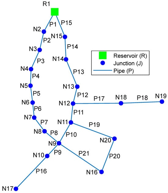 The optWDN model was applied to the New York Tunnel (NYT) network, examined in several previous studies [14,18,23,24,25,27,34]. The network includes a single reservoir, 19 nodes, and 21 pipes (Figure 2). The reservoir water level is 91.44 m above the datum, node elevations are 0.00 m, pipe diameters range between 1500 and 5100 mm, pipe lengths range between 2225 and 11,707 m, and the Hazen–Williams roughness coefficient for all pipes is 100 [2,25,42]. Under peak steady-state conditions, node demand ranges between 0.0283 and 4.818 m3/s with a total of 57.13 m3/s.
