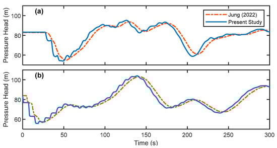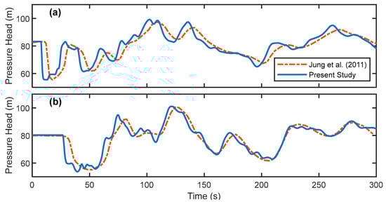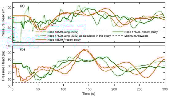 Variation in simulated pressure head with time at (a) node 17 and (b) node 19 due to sudden demand change at node 10 (scenario S1). Shown are results from the optWDN model and from Jung et al. [34].