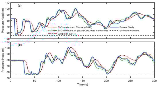 Variation in simulated pressure head with time at (a) node 17 and (b) node 19 due to sudden demand change at node 10 (scenario S1). Simulated pressure is for the existing network with duplicate pipes identified in the present study, as well as by El-Ghandour and Elansary [23], El-Ghandour et al. [25], and Jung et al. [34].