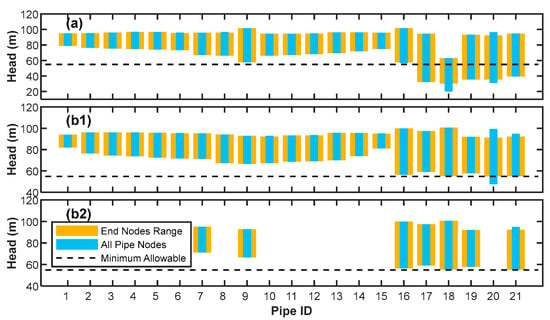 Range of simulated transient pressure heads for the (a) existing pipes of the NYT network without duplicate pipes and for the (b1) existing pipes of the NYT network with (b2) optimal duplicate pipes identified for scenario S1 using . Orange bars show the range of transient pressure heads at the two end nodes of each pipe, while cyan bars show the range along each pipe. The dashed line indicates the minimum allowable pressure head.