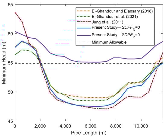 As shown in Figure 7a for the existing pipes of the NYT network, simulated transient pressure heads within pipes 17 to 21 were less than the minimum allowable head. For the set of optimal duplicate pipe diameters identified in Section 4.2 with , the pressure heads at pipe ends satisfied the minimum allowable as expected (Figure 7(b1,b2)). However, the pressure head along pipe 20 dropped below the end-node pressure for this pipe and up to 7.4 m below the minimum allowable head. These results indicate that satisfying the allowable pressure heads at pipe-end nodes does not guarantee that the allowable heads at pipe-internal nodes are also achieved. Indeed, optimal duplicate pipe diameters from Jung et al. [34], El-Ghandour and Elansary [23], and El-Ghandour et al. [25] satisfied the minimum allowable pressure head constraint at the end nodes of pipe 20 but allowed most of the pipe to experience minimum pressures that were lower than the minimum allowable value (Figure 8). Therefore, setting alone is likely insufficient to fully protect WDNs from water hammer events.