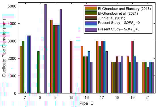 Optimized diameters of additional duplicate pipes as identified in the present study, as well as by El-Ghandour and Elansary [23], El-Ghandour et al. [25], and Jung et al. [34].