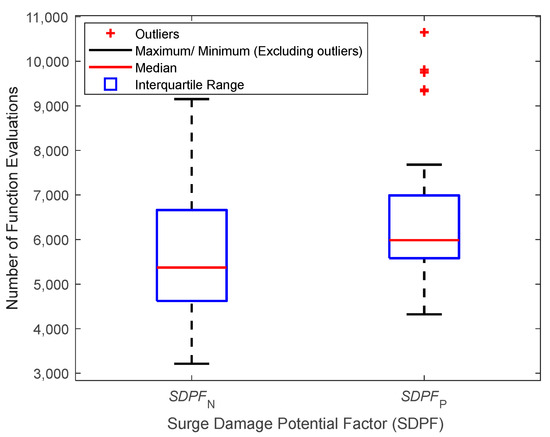 Box plot of the number of function evaluations required to achieve zero SDPF values ( and for 30 independent runs under scenario S1.