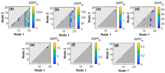 for all possible combinations of simultaneous sudden demand increase at two nodes (scenario S2) corresponding to optimized duplicate pipe diameters in each run cycle of the optWDN model. Panels (a) Run 1; (b) Run 2; (c) Run 3; (d) Run 4; (e) Run 5; (f) Run 6; (g) Run 7 correspond to run cycles 1 and 7 with 1 and 7 worst cases, respectively. Grey shading denotes node combinations giving .