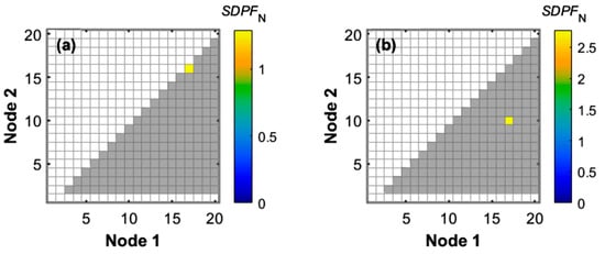 for all possible combinations of simultaneous sudden demand increase at two nodes (scenario S2) corresponding to optimized duplicate pipe diameters in each run cycle of the optWDN model. Panels (a,b) correspond to run cycles 1 and 2 with 9 and 10 worst cases, respectively. Grey shading denotes node combinations giving .