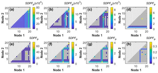 As defined in Equation (8), the SDPF represents the sum of magnitudes of deviations of simulated pressure heads from the minimum and maximum allowable transient pressure heads when these limits are exceeded. Previous researchers, including Jung and Karney [14,24], Jung [18], El-Ghandour and Elansary [23], and Jung et al. [34], calculated the SDPF based only on transient pressure heads at pipe end nodes, referred to hereafter as . This study introduces an additional SDPF version, , calculated from transient pressure heads at all computational nodes along pipes, including pipe end nodes. An indicates no exceedance at pipe end nodes, while an indicates no exceedance along the full length of WDN pipes. In Equation (8), equals 2 for and the total number of all computational nodes for .