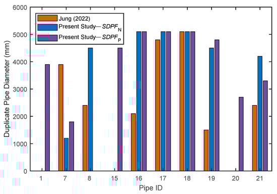 Optimized diameters (mm) for duplicate pipes with total cost identified by the present study as well as by Jung [18] for scenario S2.