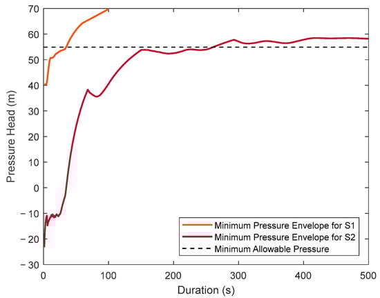 The long duration of 260 s for the demand increase is likely impractical, particularly with the opening of fire hydrants. By slightly relaxing the minimum pressure constraint from 54.9 m to 53.72 m, a shorter duration of 150 s was achieved, though this remains too long for practical application. A more viable solution could be to use a combination of duplicate pipes along with the regulation of the demand increase duration. There are two possible approaches to applying this hybrid solution. In the first approach, the designer selects a feasible duration to be used for regulating the demand increase (e.g., 15 s for operating fire hydrants [36]) and applies the optWDN model to optimize the duplicate pipe diameters needed to satisfy pressure constraints. Alternatively, the pressure envelope versus duration, as shown in Figure 16, can be utilized to select a suitable value for the demand increase duration that minimizes pressure violations or is within relatively flat regions of the envelope curve where slight variations in duration would not cause excessive changes in the corresponding minimum pressure. For example, as indicated by the envelope curve for S2, a duration of about 80 s would cause a minimum simulated pressure of 35.65 m, less by 19.25 m below the 54.9 m limit. Even if the duration control was not completely successful and the duration decreased by ~12% to 70 s, the resulting minimum simulated pressure would not decrease below the allowable threshold.