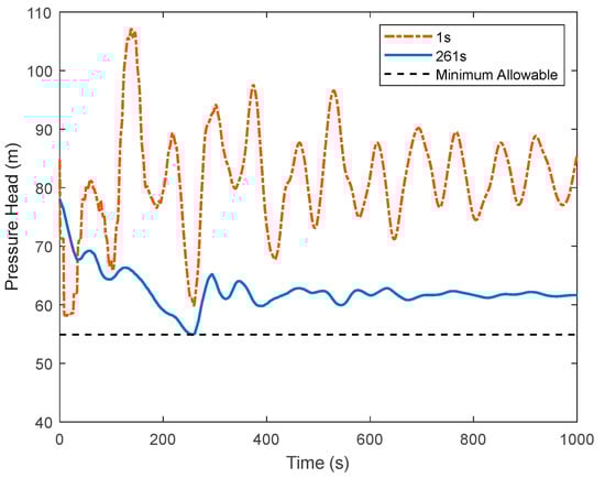 Aside from the cost savings, controlling demand increases duration, minimizes cyclic pressure fluctuations, and reduces fatigue. As shown in Figure 17, the standard deviation for the pressure head at node 19 over 1000 s amounted to 8.7 m and 3.1 m for the durations of 1 and 261 s, respectively. The nearly threefold decrease in standard deviation for the longer duration clearly demonstrates the reduction in pressure fluctuations through gradual sudden demand.
